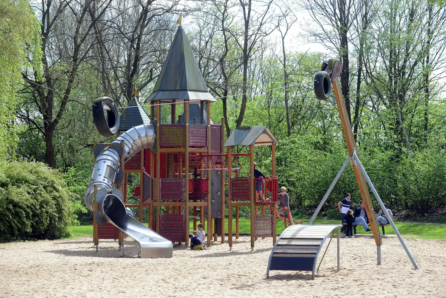 De grote speeltuin ligt in het oostelijk deel van het domein en is vanaf parking Oost snel bereikbaar. Dit is het rustige en groene deel van het recreatiepark waar je kan wandelen. Je kinderen kunnen zich hier naar hartelust uitleven op de klimtorens, buisglijbanen, het klimnet, de kabelbaan, het doolhof ...