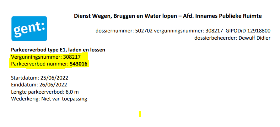 - Inname parkeerstrook: ten laatste 10 werkdagen voor de inname indienen