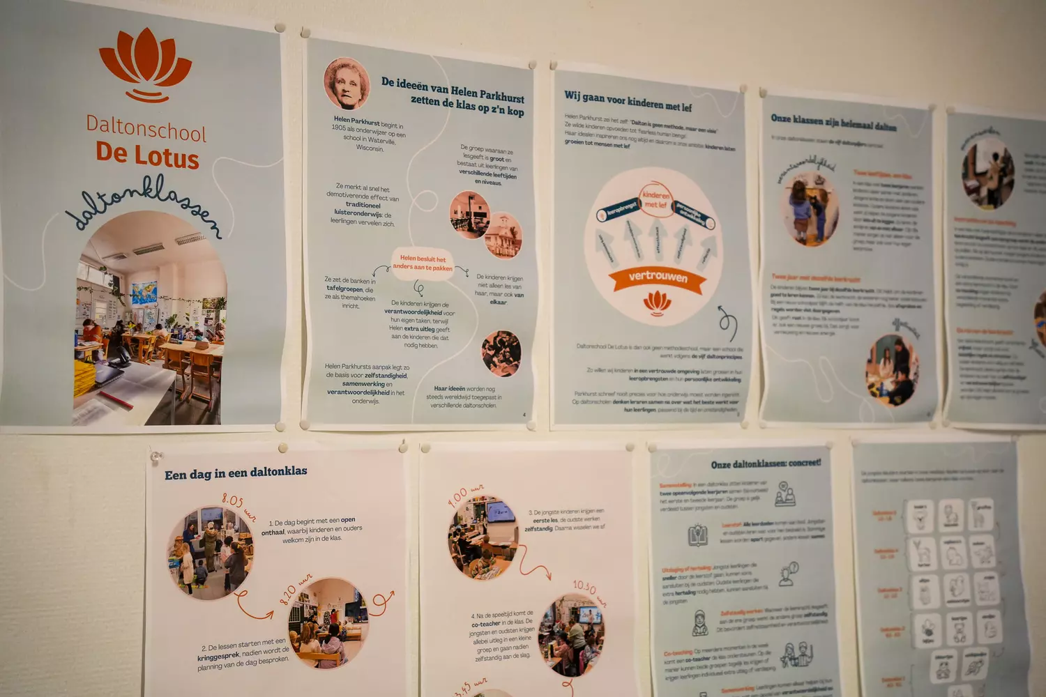 De school koos er ook voor om een brochure te ontwikkelen. Bram: 'We wilden iets dat er mooi uitzag, maar ook inhoudelijk sterk was. Er is veel werk ingestoken, door ons en door de leerkrachten, dus dat verdient zorgvuldige communicatie. We lieten de tekst nalezen om zeker te zijn dat hij voor iedereen begrijpelijk was, ook voor laaggeletterde ouders. Naast onze visie, die we schematisch weergaven, voegden we ook ‘een dag in een daltonklas’ toe. Leerkrachten namen zelf foto’s van herkenbare momenten, zoals het kringmoment. Dat maakt het heel concreet en tastbaar.'